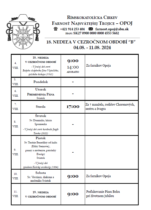 Farské oznamy - 32. týždeň 2024.pdf Typ: PDF dokument, Velkosť: 291.57 kBRozpis sv. omší - 32. týždeň 2024.pdf Typ: PDF dokument, Velkosť: 362.66 kB